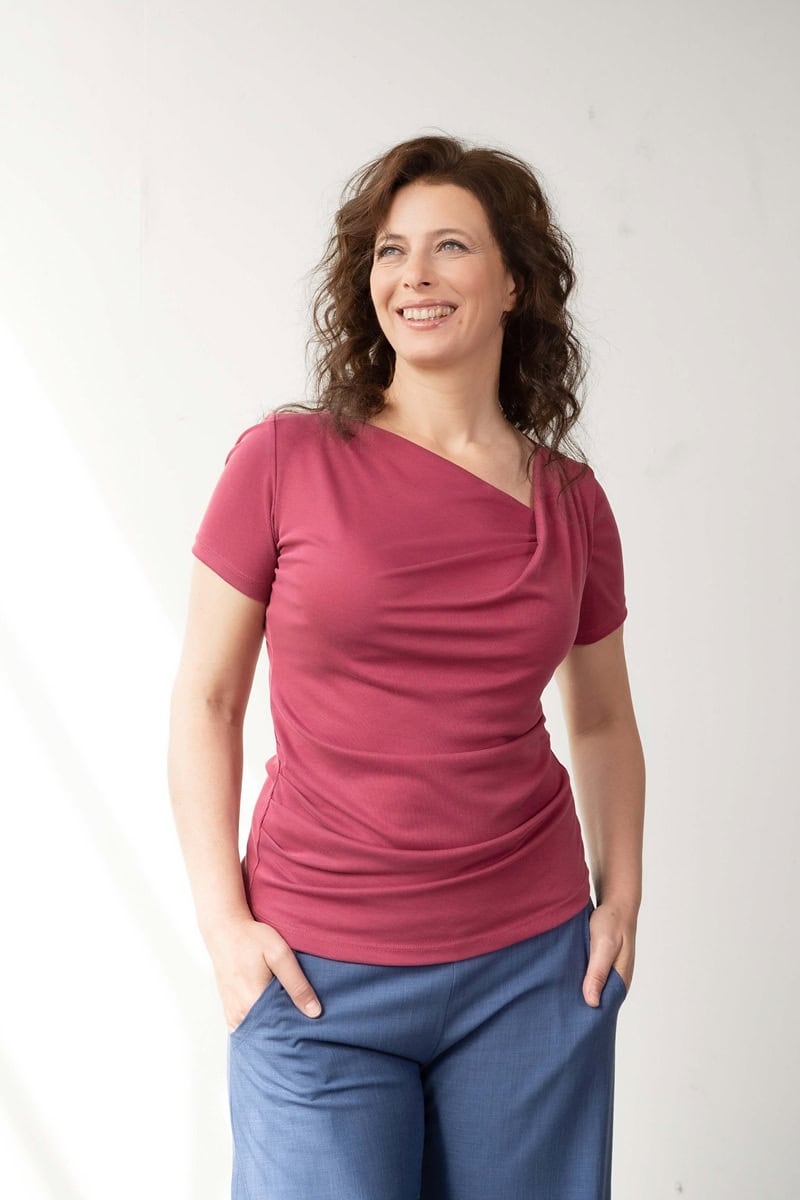 A jersey shirt with a unique asymmetrical neckline, flattering pleats and short sleeves. It has a slim fit cut.